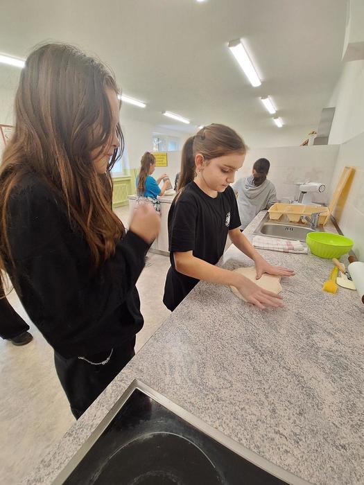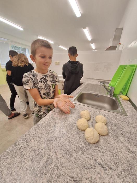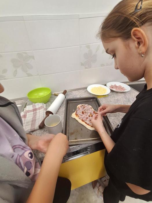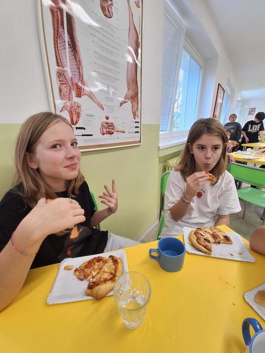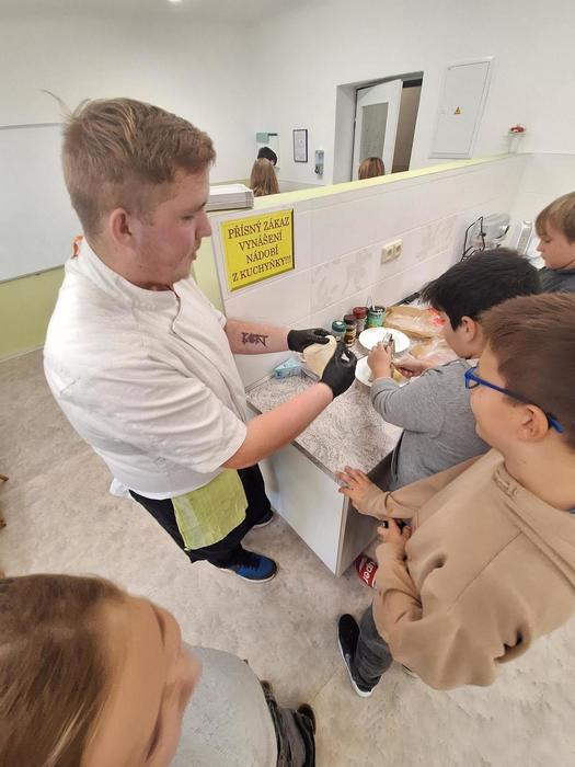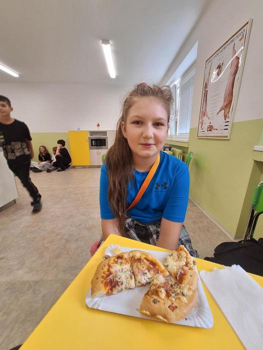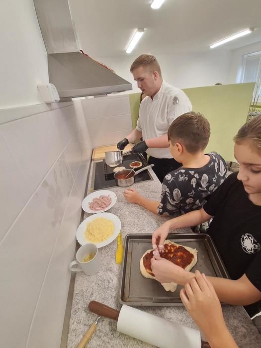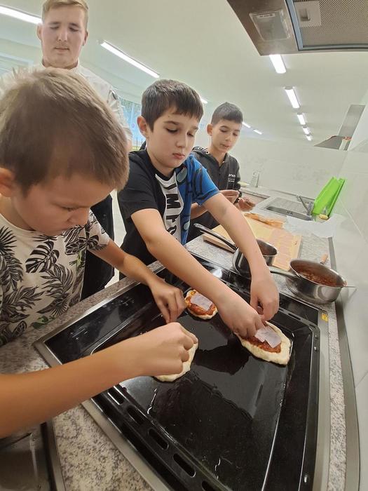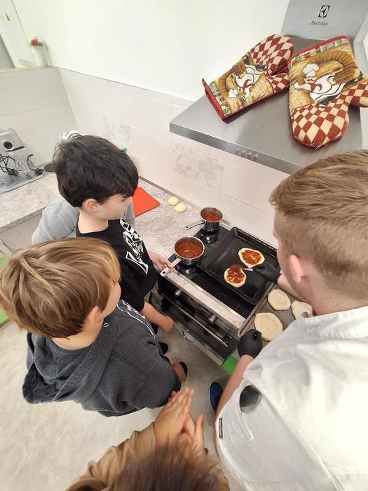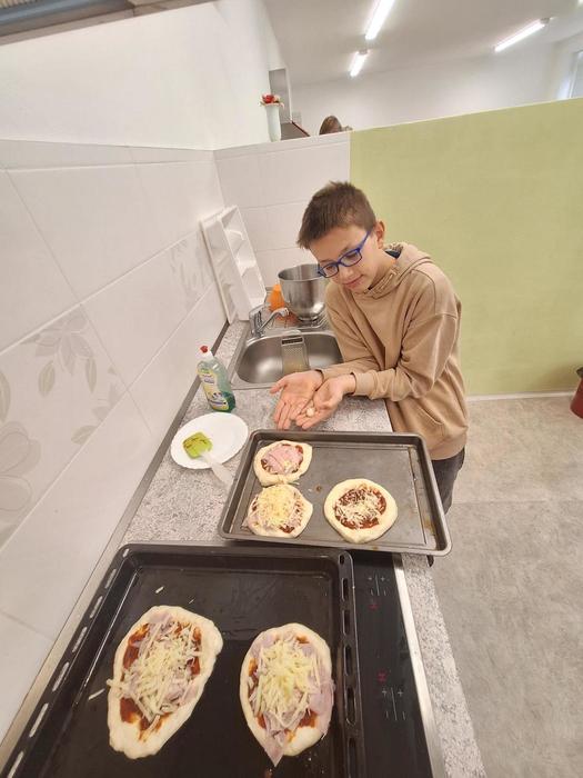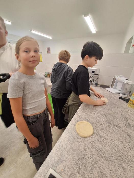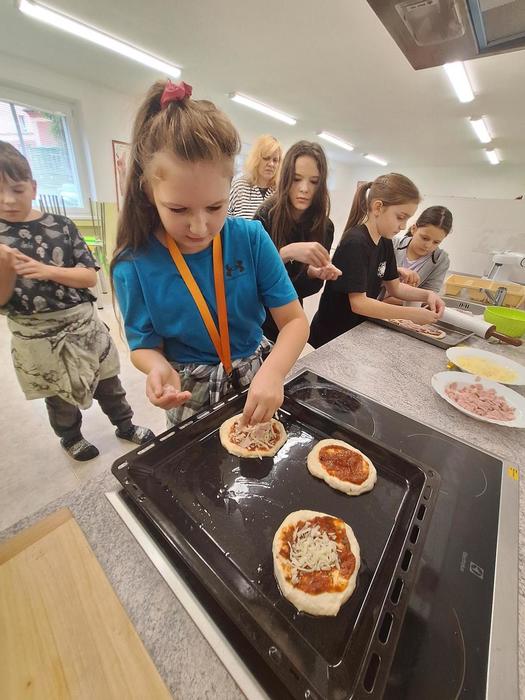 Honza připravil kynuté těsto a žákům ukázal jak s ním budou pracovat. Poté začalo to pravé kouzlo – zdobení mini pizz. Děti měly k dispozici různé ingredience, od dvou druhů rajčatového sosu přes sýry až po čerstvou zeleninu, šunku a mohly si svou pizzu ozdobit ananasem. Každý žák měl možnost vyjádřit svou kreativitu a vytvořit si vlastní jedinečnou pizzu. Někteří zvolili klasickou kulatou, jiní se snažili udělat pizzu ve tvaru srdce nebo ducha. Bylo skvělé sledovat, jak se z kuchyně linula vůně pečených pizz a jak se všichni snažili, aby jejich výtvory vypadaly co nejlépe.