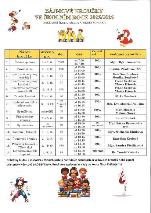 Přihlášky budou poskytnuty na třídních schůzkách 9.9.2025, popř. u vedoucích kroužků nebo u školní asistentky p.Němcové v hlavní budově školy.