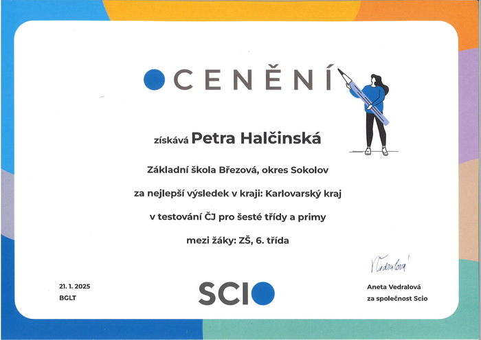 Velmi nás potěšil krásný výsledek, vlastně nejlepší v Karlovarském kraji, který díky výborně zvládnutému testu v českém jazyce pro 6. třídy a primy víceletých gymnázií získala naše žákyně Petra Halčinská.