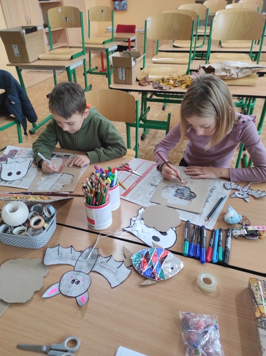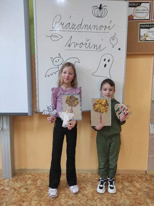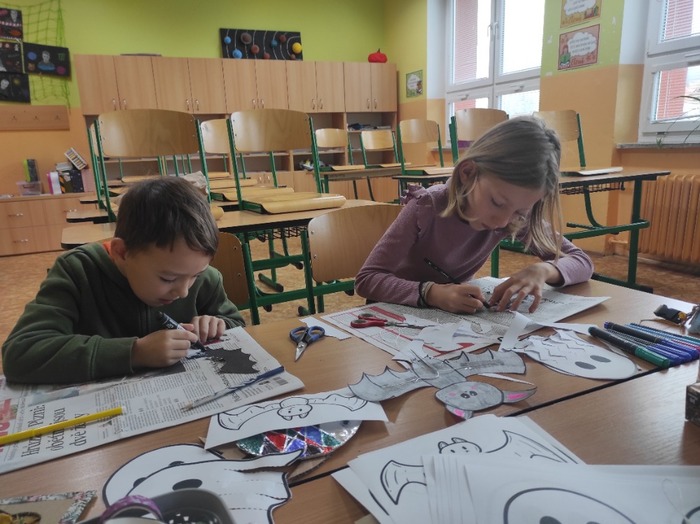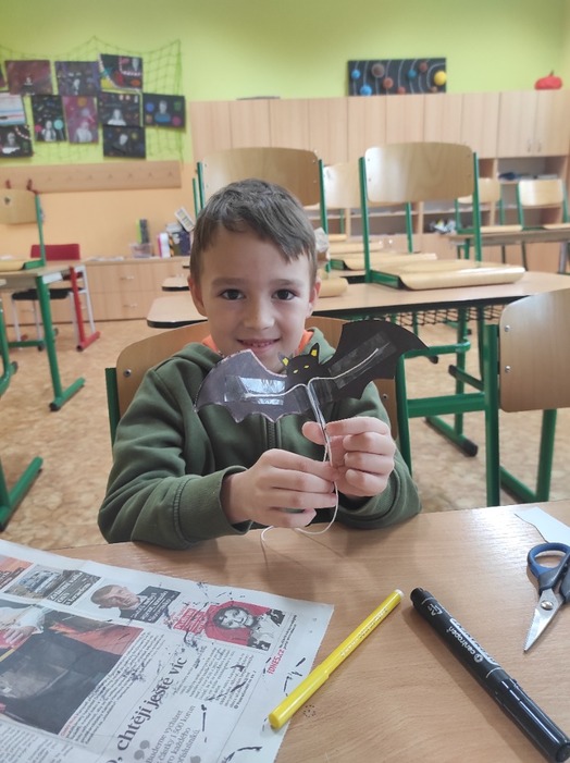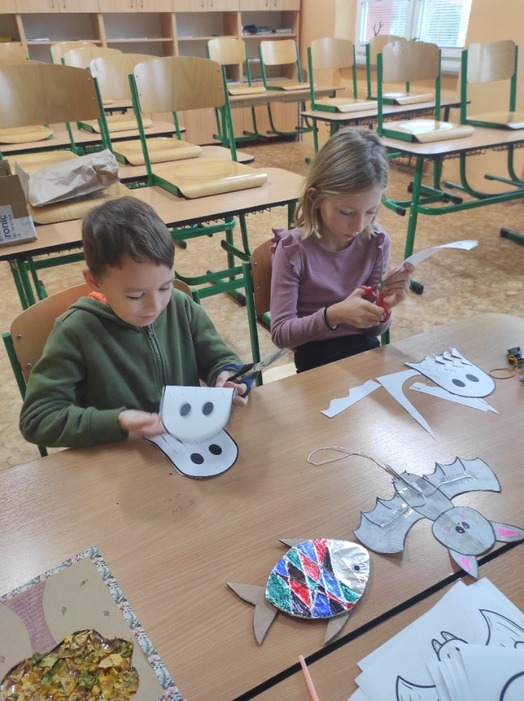 Do školy jsme nemuseli, ale přesto jsme se v úterý dopoledne sešli v lavicích při prázdninovém tvoření. Emičce a Maksimovi stačila ta lavice jen jedna, i tak jsme si stříhání duchů, výrobu netopýra, který pohybuje křídly, stromu z kartonu a listí, ryby nebo anděla náramně užili.