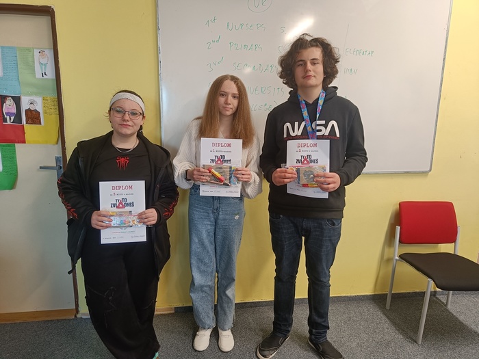Školní kolo soutěže se konalo ve 2 fázích, a to prostřednictvím online testů v listopadu a březnu tohoto školního roku. Kdo chtěl našemu týmu Deváťáků zlepšit bodový výsledek, mohl vypracovat bonusové kolo zaměřené na poskytnutí první pomoci člověku s příznaky mrtvice. V rámci naší skupiny si nejlépe vedli žáci a žákyně Andrejka B., Lukáš P. a Míša F., kteří se umístili na prvních třech místech. Celý tým našich žáků si navíc svými výsledky vysloužil postup do květnového krajského kola, kam zamíří vybrané čtyřčlenné družstvo.