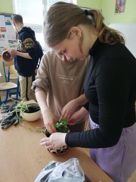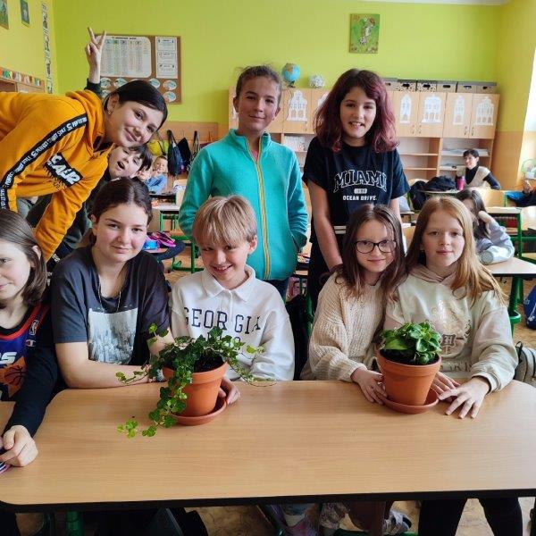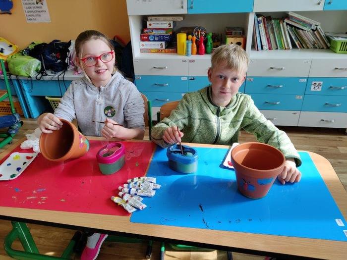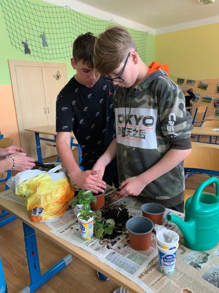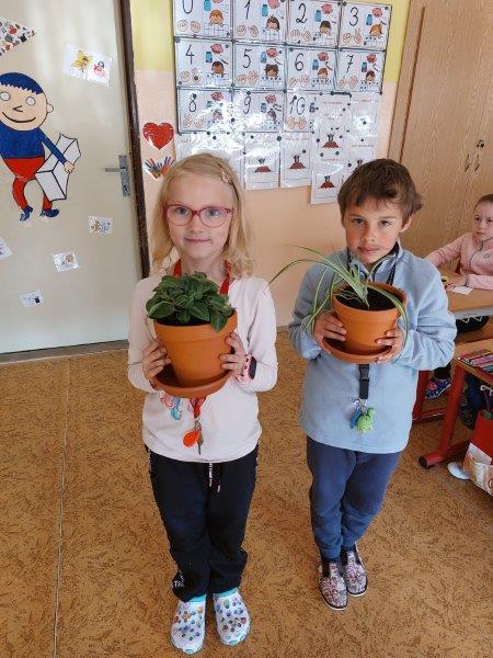 Základním mottem našeho Dne Země bylo: „Ozeleňme si školu“. Během covidové doby postupně ze tříd (díky nutnému ozónování) vymizely rostliny, které jednak prostředí školy zpříjemňují, jednak pomáhají čistit vzduch přirozeně. Rozhodli jsme se je alespoň částečně vrátit do tříd. Škola nakoupila květináče, zeminu a sazenice pokojových rostlin a ekotýmáci rozdali vše do jednotlivých tříd. Žáci pak měli za úkol hliněné květináče libovolně nazdobit a zasázet do nich rostlinky, o které pak budou během roku pečovat.