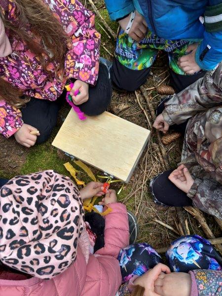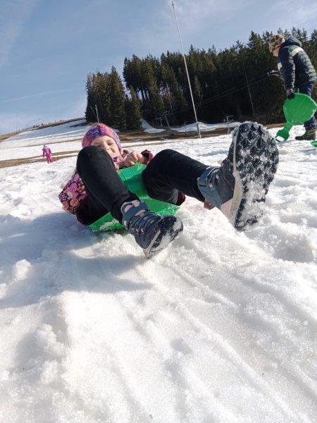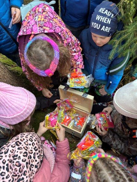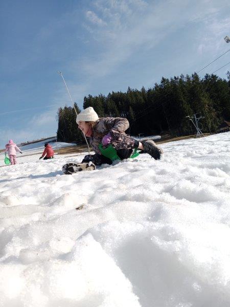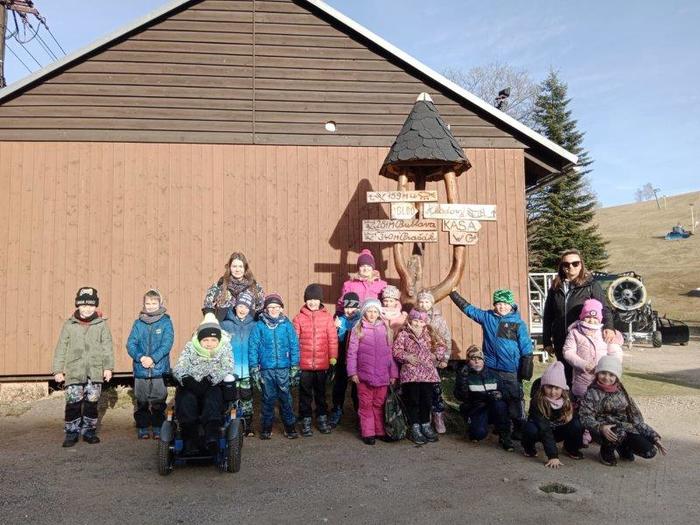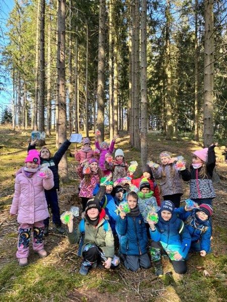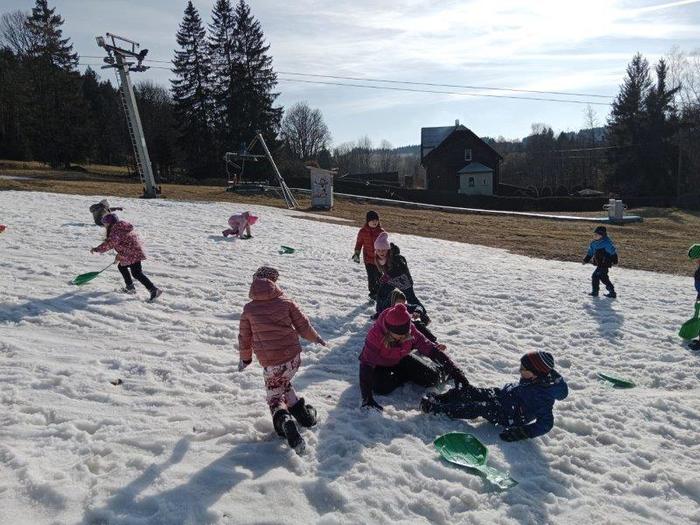 Tři dny školy v přírodě utekly jako voda a už tu máme čtvrtek. Ráno byla venku mlha, že by nám jí mohl závidět i Rákosníček :-), naštěstí se ale pak objevilo i sluníčko. Ještě před snídaní jsme objevili dopis od trpaslíka Bubly se zadáním dnešních úkolů a pak už jsme si naplnili svá bříška naší oblíbenou čokoládovo – mléčnou snídaní. Dopoledne jsme se pilně učili, četli jsme, počítali a trošku i psali a po svačině jsme vyrazili do přírody. Čekal na nás rébus, který jsme museli vyluštit, abychom získali další nápovědu k pokladu a zvládli jsme to hravě! Pak jsme se vydali do místního obchůdku, koupit si dobrotu na vylepšení poledního klidu. Stihli jsme ještě udělat s bublifuky bubliny, namalovat umělecká díla křídami na chodník před hotelem, a pak už jsme celí hladoví vtrhli do restaurace. K obědu jsme měli kuřecí vývar a kuřízek s bramborovou kaší, mňam! Po zaslouženém odpočinku jsme se vydali na pravou horskou túru. Vyšplhali jsme se na nejvyšší kopec v okolí Bublavy – Bleiberg, neboli Olověnou horu. A jako odměnu jsme dostali Horalku :-). Cestou zpátky jsme si zpívali, aby nám cesta utekla rychleji. Po krátkém zastavení se na svačinu v hotelu jsme se rozhodli, že se půjdeme ještě jednou podívat na koně. Cestou jsme ale zjistili, že kolem lesa jsou uvázané barevné fáborky. Nedalo nám to a vydali jsme se podle nich na cestu. Čekalo na nás několik úkolů (třeba: vytvoř z přírodnin první písmeno svého jména, předveď slona, stůj co nejdéle na jedné noze…) až na nás čekal u trpasličího domu dopis. Našli jsme poklad trpaslíka Bubly! Pod haldou klacků byly ukryté dvě bedny s odměnou pro holčičky i kluky. Společně jsme si vzpomněli na všechny nápovědy a zapeklité zámky jsme dokázali otevřít. To bylo radosti!