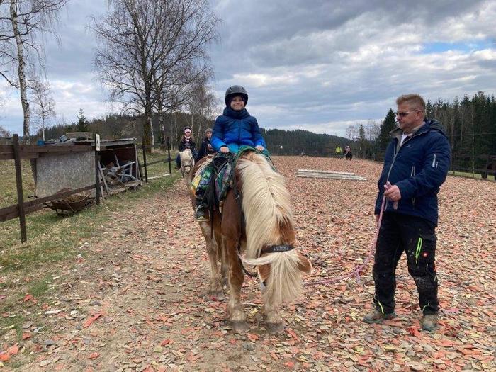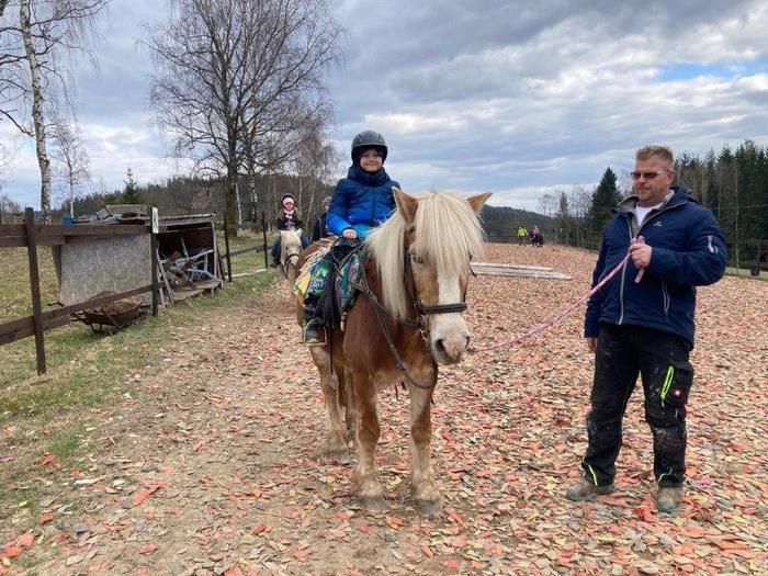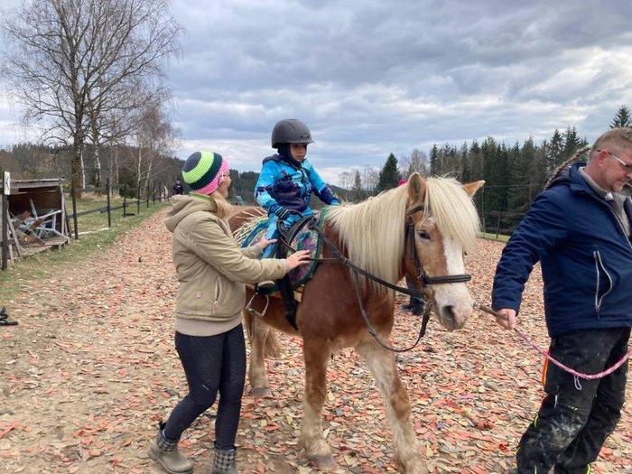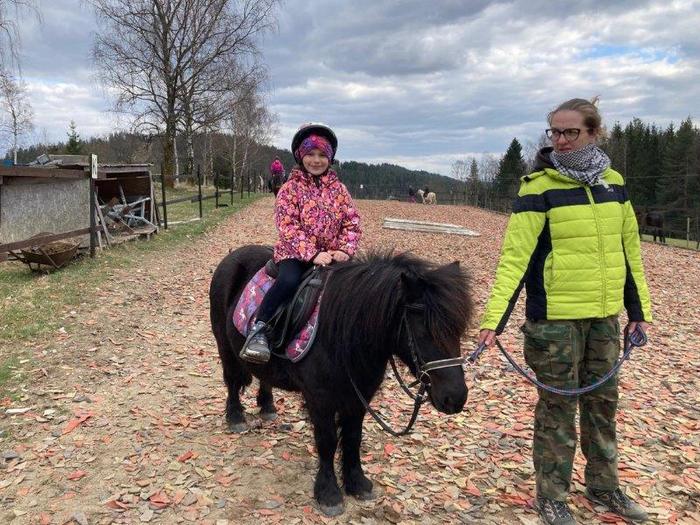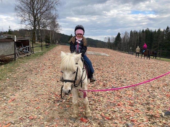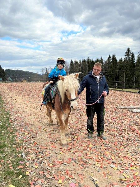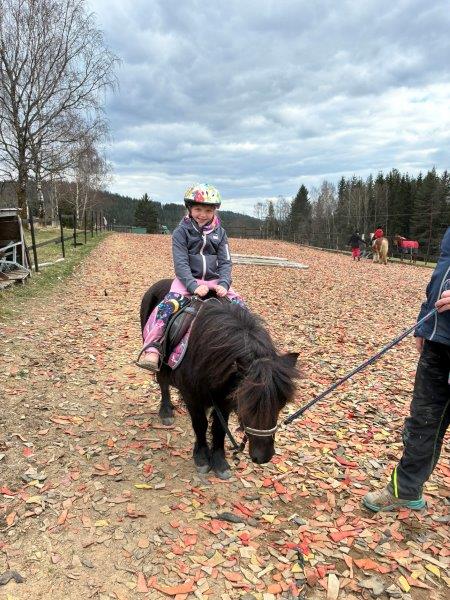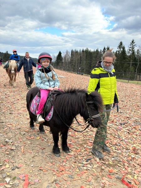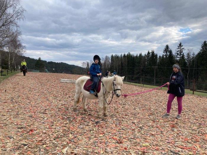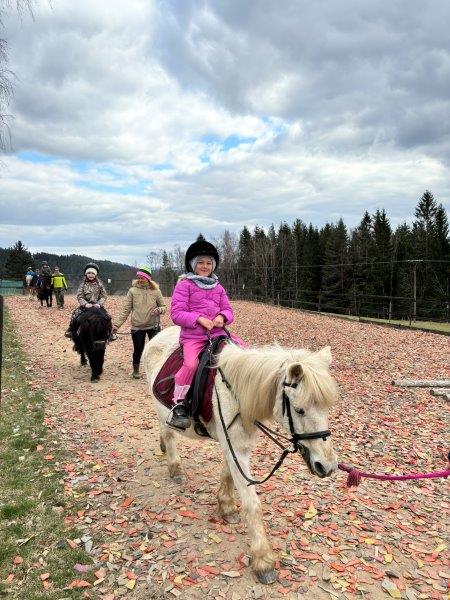 Když jsme se ráno probudili, venku bylo zataženo a vypadalo to, že každou chvíli začne pršet. Naštěstí mraky ale horský vítr rozfoukal a my jsme strávili skoro půlku dne venku v přírodě. Po snídani (máme po dnešku strach, že dojde zásoba čokoládových kuliček a mléka) jsme se vrhli na psaní dopisu. Malovali jsme i psali na korespondenční lístky. Po svačině jsme našli další zadání úkolů, které dnes musíme splnit, abychom dostali další nápovědu k pokladu. Ještě před obědem jsme se vydali naše dopisy hodit do poštovní schránky, snad všem adresátům přijdou včas :-) . K obědu jsme měli zelňačku a sekanou se šťouchanými brambory. Psaní i vycházka nás trošku unavila, a tak jsme si po O trošku odpočinuli. Nezapomněli jsme také popřát naší Emmičce k svátku :-). Odpoledne nás totiž čekal slibovaný výlet za koníky. Nejprve jsme si zadováděli na hřišti a pak jsme se povozili na konících – Sněhurce, Angelice, Lucasovi a Moly. Moc jsme si to užili!