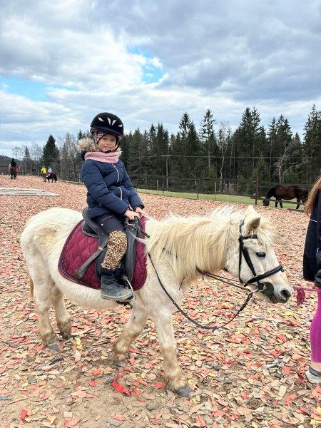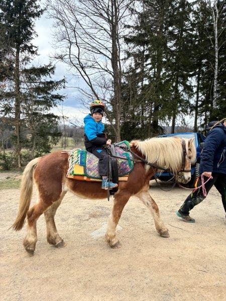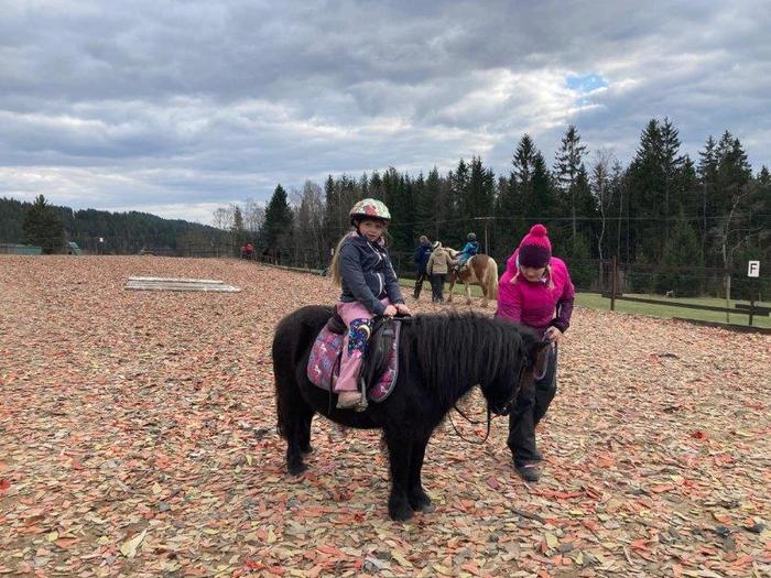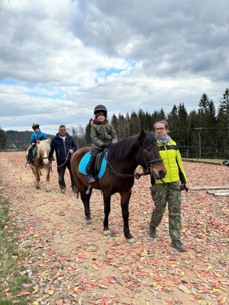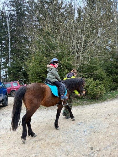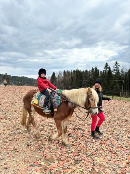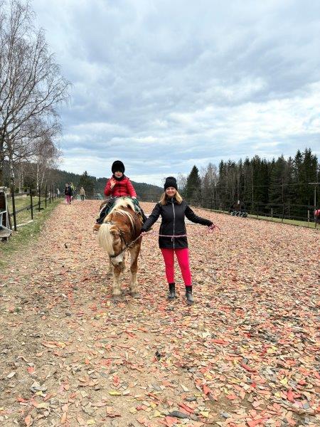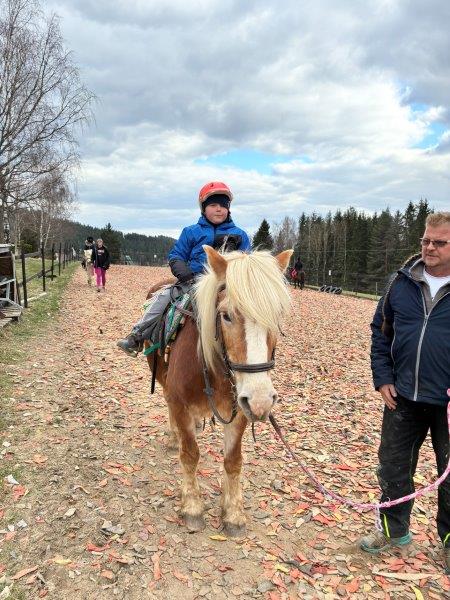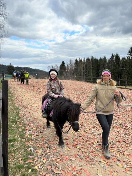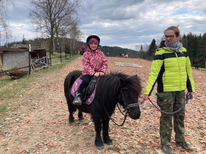 Když jsme se ráno probudili, venku bylo zataženo a vypadalo to, že každou chvíli začne pršet. Naštěstí mraky ale horský vítr rozfoukal a my jsme strávili skoro půlku dne venku v přírodě. Po snídani (máme po dnešku strach, že dojde zásoba čokoládových kuliček a mléka) jsme se vrhli na psaní dopisu. Malovali jsme i psali na korespondenční lístky. Po svačině jsme našli další zadání úkolů, které dnes musíme splnit, abychom dostali další nápovědu k pokladu. Ještě před obědem jsme se vydali naše dopisy hodit do poštovní schránky, snad všem adresátům přijdou včas :-) . K obědu jsme měli zelňačku a sekanou se šťouchanými brambory. Psaní i vycházka nás trošku unavila, a tak jsme si po O trošku odpočinuli. Nezapomněli jsme také popřát naší Emmičce k svátku :-). Odpoledne nás totiž čekal slibovaný výlet za koníky. Nejprve jsme si zadováděli na hřišti a pak jsme se povozili na konících – Sněhurce, Angelice, Lucasovi a Moly. Moc jsme si to užili!