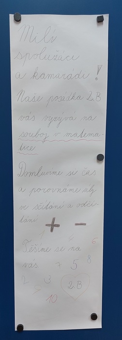 Vyzvali jsme žáky 2. A na souboj v matematice. Dne 16. 11. 2022 jsme se první hodinu sešli v lobby a přeměřili své znalosti a rychlost v počítání do dvaceti s přechodem přes desítku. Dohlížel na nás Jan Ámos Komenský. Za 15 minut ve dvanácti žácích jsme vypočítali správně 1451 příkladů. A to je super.