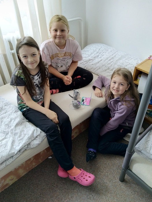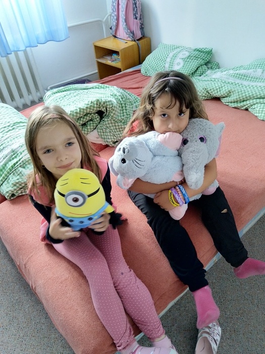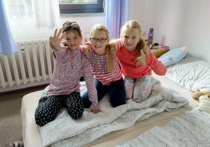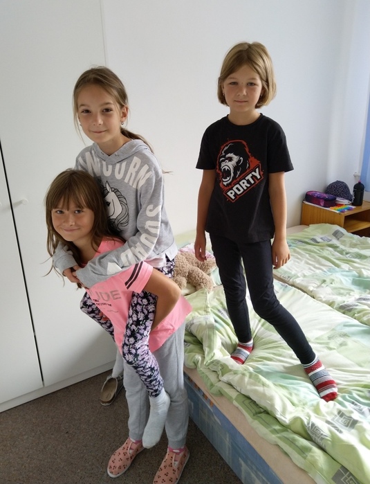 Verunka: „Ahoj mami, moc Vás pozdravuju. Na pokoji jsem se Sárkou, Adélkou, Eliškou, Terkou a Péťou.“