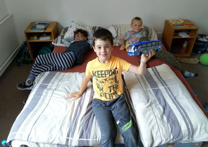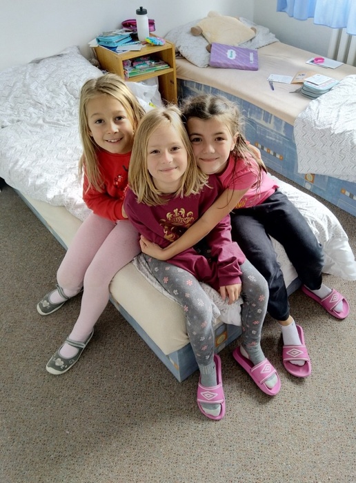 Jsme tu nejstarší a tak jsme „vyhráli“ bydlení úplně nahoře. Bydlíme po třech a všichni spíme, s kým jsme si přáli.