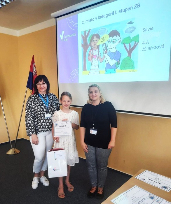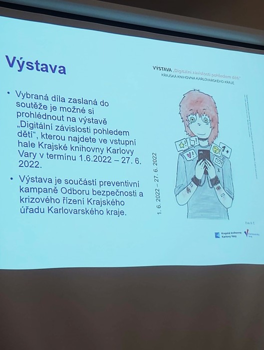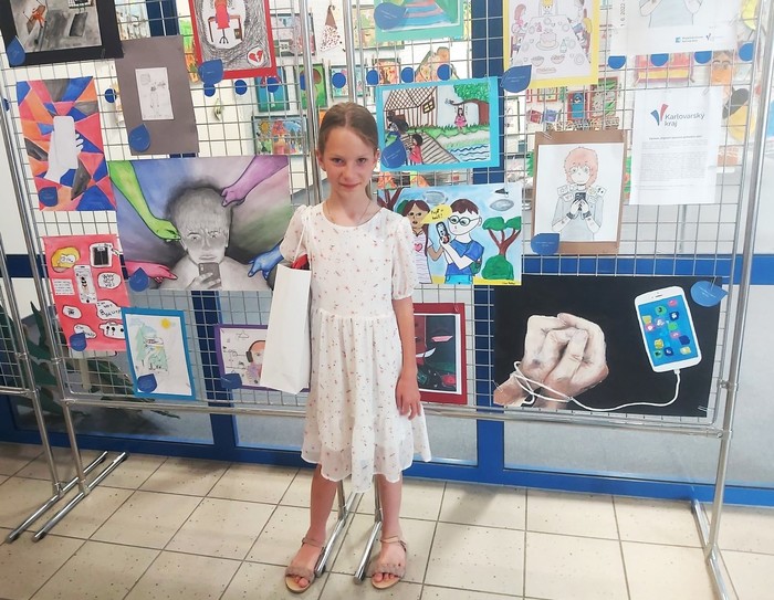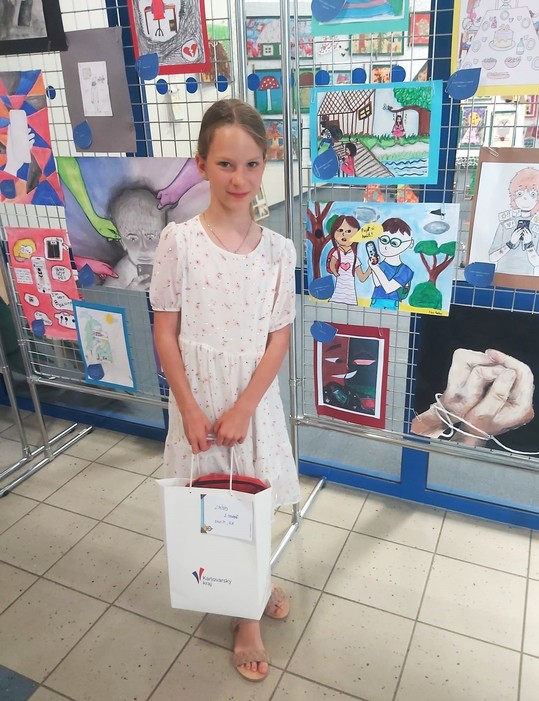 Přijali jsme výzvu Karlovarského kraje namalovat obrázek do soutěže Digitální závislosti. O tomto problému jsme hodně povídali, takže děti měly hned plno nápadů, jak téma výtvarně uchopit. Několik vydařených prací jsme poslali do soutěže. V pondělí 20. 6. 2022 se konalo v budově Krajského úřadu v Karlových Varech vyhlášení vítězů. Obrázek naší Silvinky skončil na druhém místě. Silvinka byla pozvána, aby si převzala ocenění za tento úspěch. Gratulujeme!
