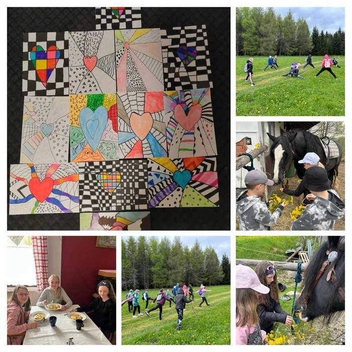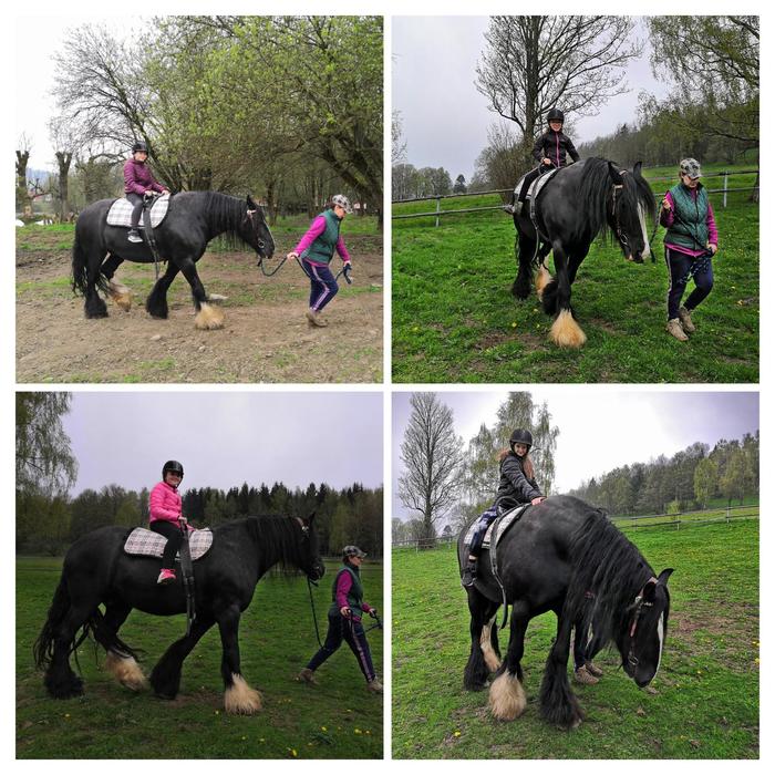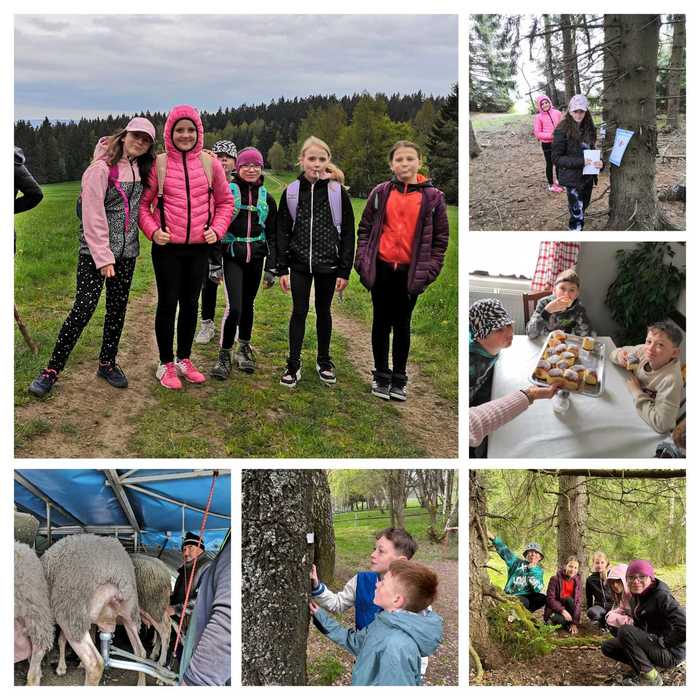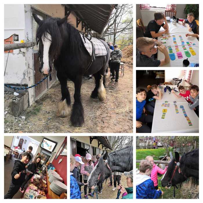 Po snídani jsme si hrou zopakovali vzory podstatných jmen a zlomky (Já mám, kdo má…?), a pak už jsme konečně vyrazili ke koníkům! Jsou to pěkní obři, někteří z nás se trošku báli, ale nakonec nás povozil všechny. Po buchtičkách se šodó jsme vyrazili kolem Čimického vrchu a cestou jsme si zahráli rébusy s příslovími (byla to makačka, ráno nám přísloví ještě moc nešla :-)), taky jsme zjistili u bači, jak se moderně dojí ovečky a po 8,5 kilometrech hurá na špagety!