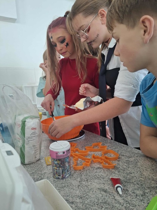 Halloweenská tradice je oblíbená i mezi námi, a tak jsme si lehce s předstihem udělali halloweenskou atmosféru i u nás ve škole. Tematický den pořádaný školním parlamentem obohatily i hodiny pracovní výchovy, kde část z nás upekla halloweenské sušenky. Mňam!