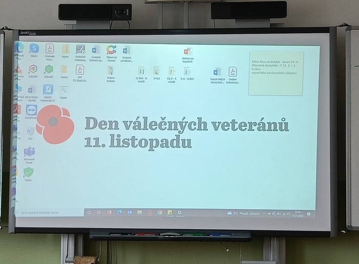 11. 11. si připomínáme všechny, kteří si prošli válečnými útrapami a zasloužili se o mír. Na jejich počest si symbolicky připínáme květ vlčího máku jako upomínku padlých ve válečných konfliktech. Den válečných veteránů jsme si připomněli i my během dnešní hodiny češtiny, kdy jsme si přečetli báseň z 1. světové války, pobavili se o tom, proč je důležité si osudy válečných veteránů připomínat, a na závěr hodiny jsme každý sám za sebe napsal vzkaz adresovaný válečným veteránům. Někteří z nás také přispěli koupí vlčího máku symbolickou částkou 30 Kč do sbírky Paměti národa, která v ČR přímo podporuje válečné veterány a další bojovníky za svobodu. Výtěžek ze sbírky jde také na uchování jejich vzpomínek, neboť je důležité zachovat svědectví těchto lidí pro budoucí generace.