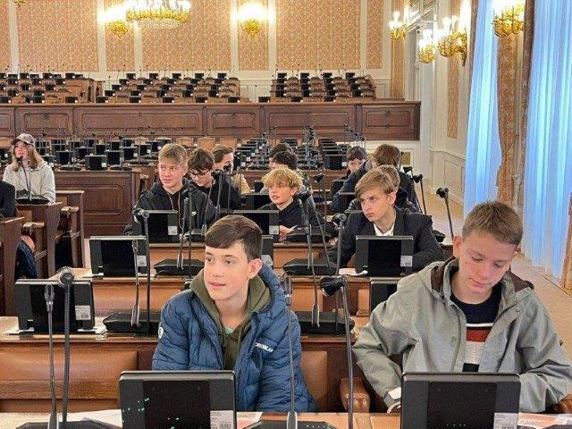 Po příjezdu do našeho hlavního města jsme se prošli po Karlově mostě a poté se vydali do Poslanecké sněmovny, kde nás již přivítala paní poslankyně Renata Oulehlová a její asistent. Po důkladné prohlídce u vstupu jsme se přemístili do druhého největšího jednacího sálu, kde v současné době sídlí poslanecký klub. Děti zhlédly krátký film o historii a vzniku sněmovny i senátu, poté vyplnily zajímavý pracovní list a měly možnost vyzkoušet mikrofony u každého stolku, když odpovídaly na položené otázky.