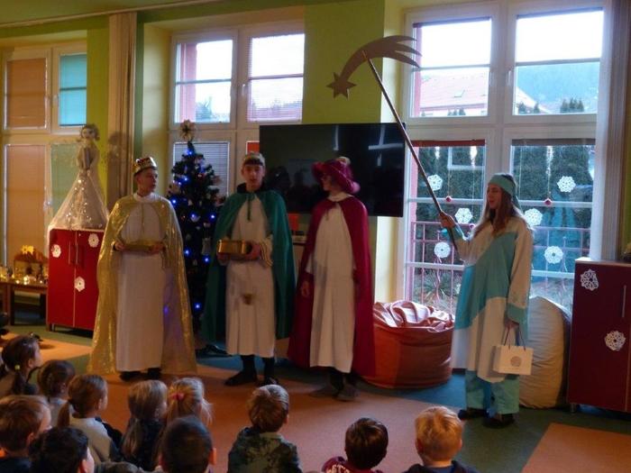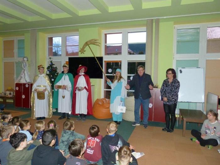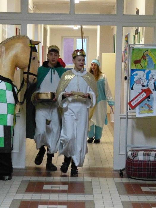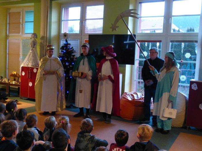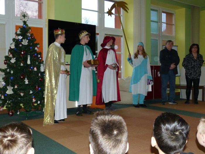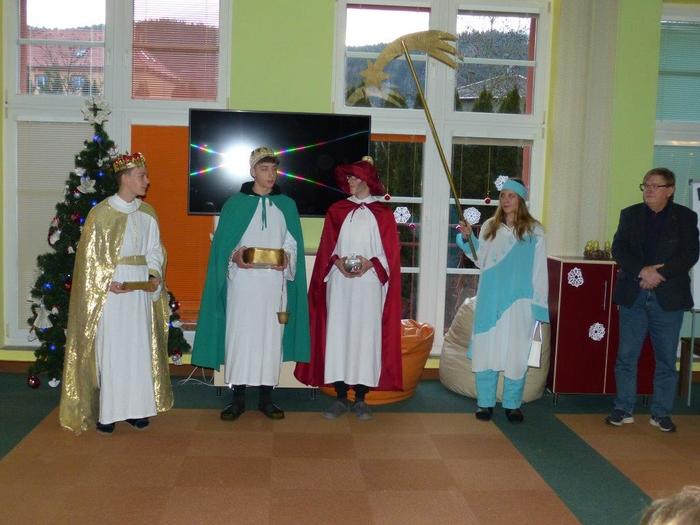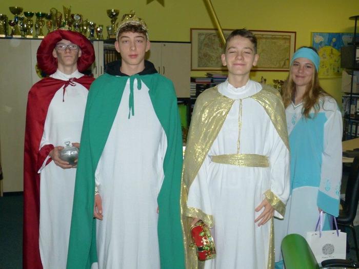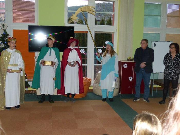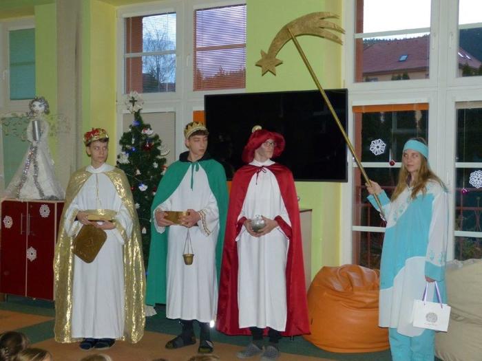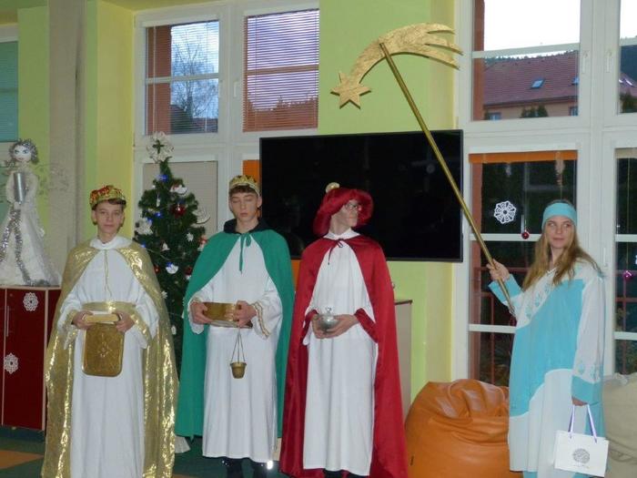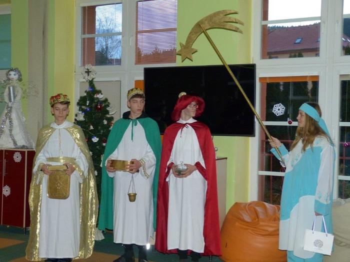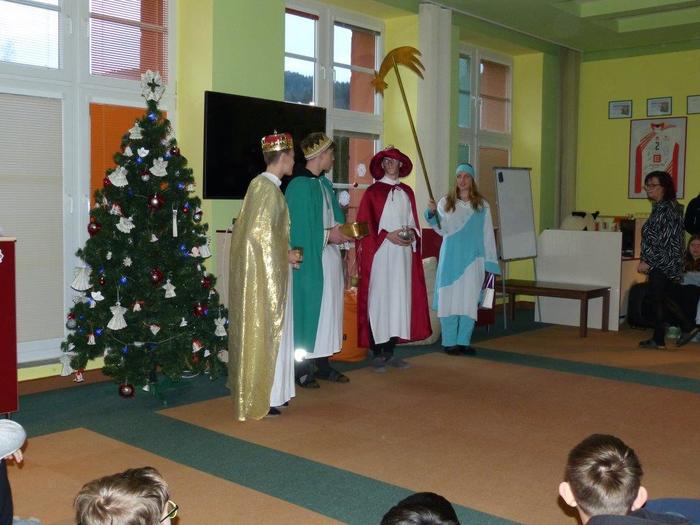 I letos se ujali těchto rolí žáci 9. ročníku - David, Béďa, David a Bára. Všichni k těmto úlohám přistupovali velmi zodpovědně, a tak byla navozena sváteční, téměř mystická atmosféra. Tři králové tradičně odpoledne doprovázejí i pana Králiče s Tříkrálovou sbírkou. Za svůj výkon si zasloužili velké uznání a mnoho chvály.