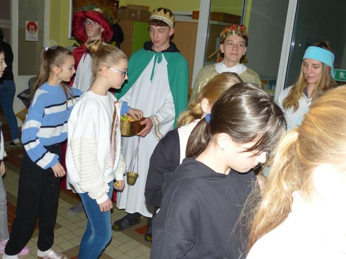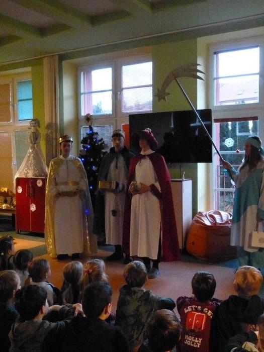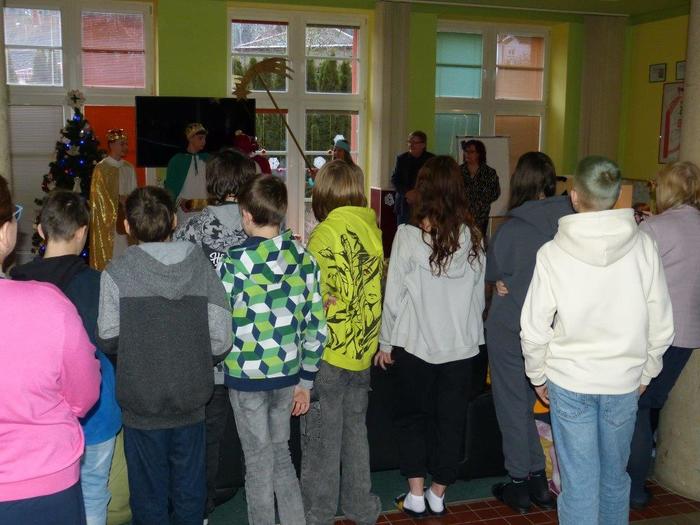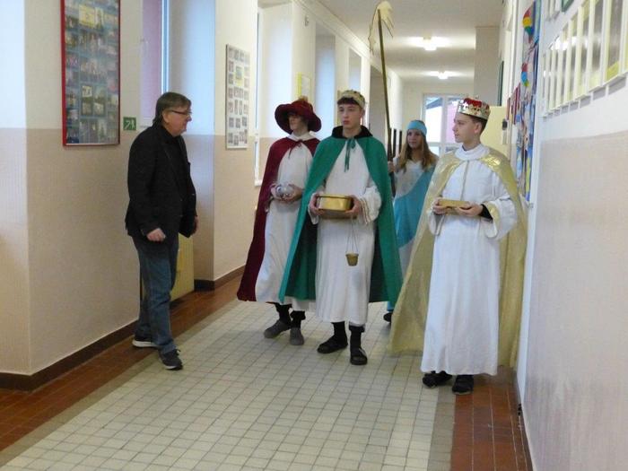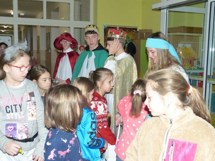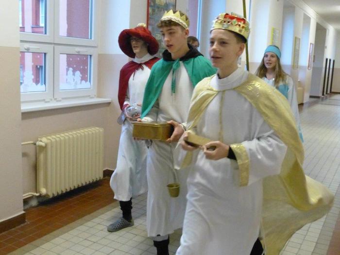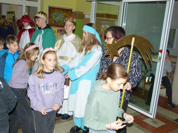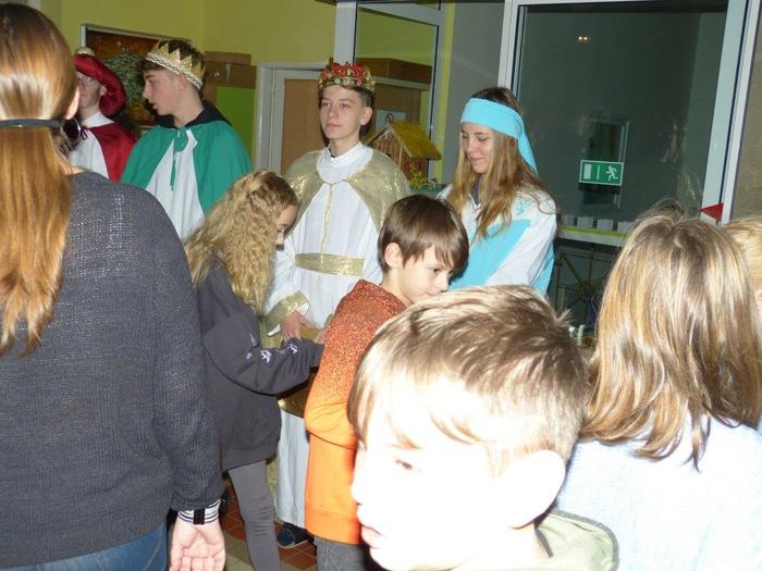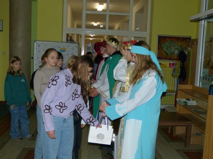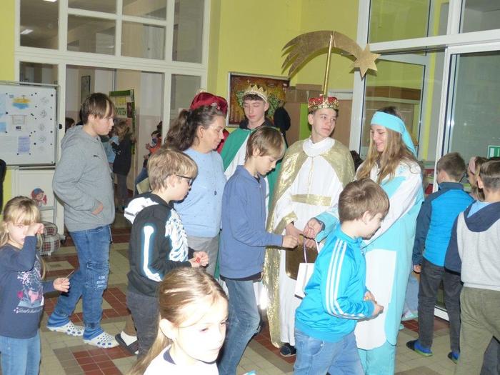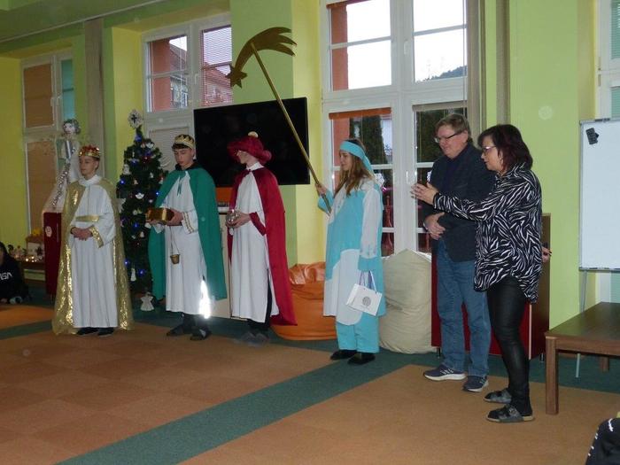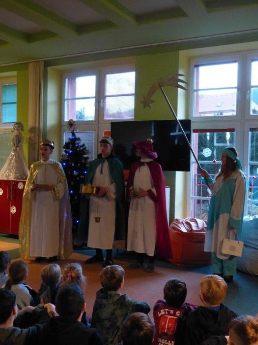 I letos se ujali těchto rolí žáci 9. ročníku - David, Béďa, David a Bára. Všichni k těmto úlohám přistupovali velmi zodpovědně, a tak byla navozena sváteční, téměř mystická atmosféra. Tři králové tradičně odpoledne doprovázejí i pana Králiče s Tříkrálovou sbírkou. Za svůj výkon si zasloužili velké uznání a mnoho chvály.