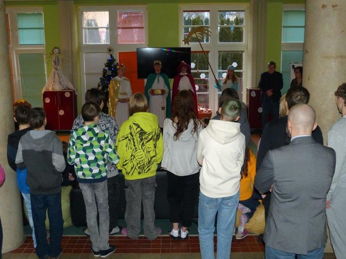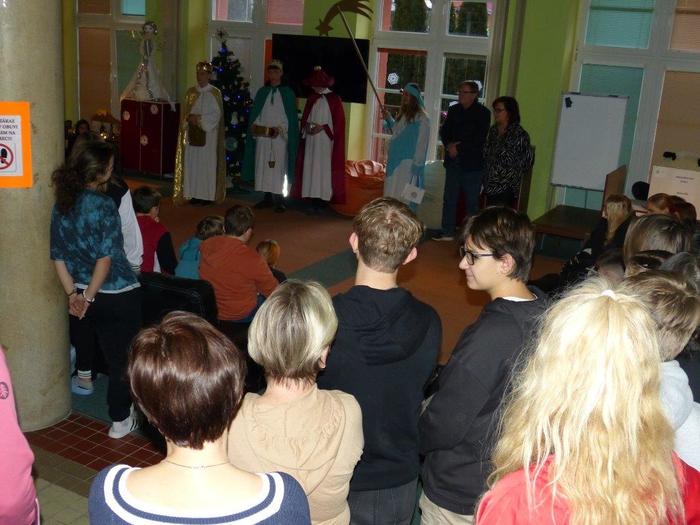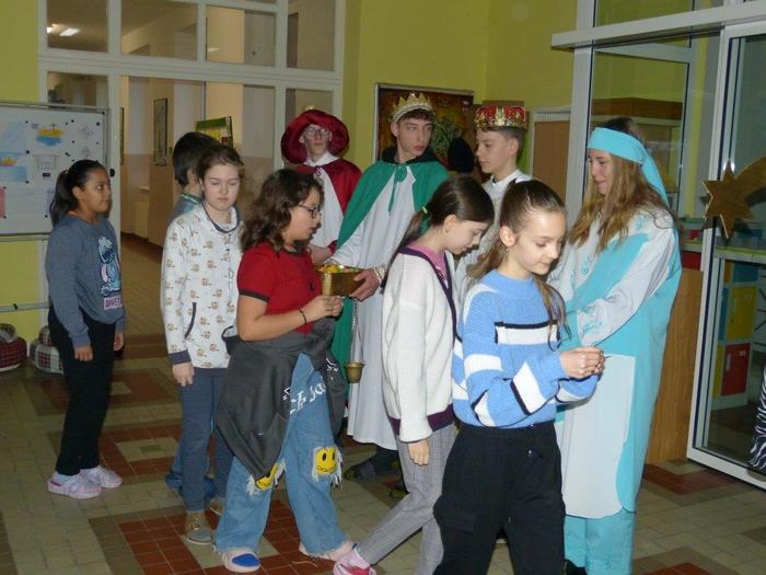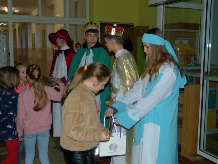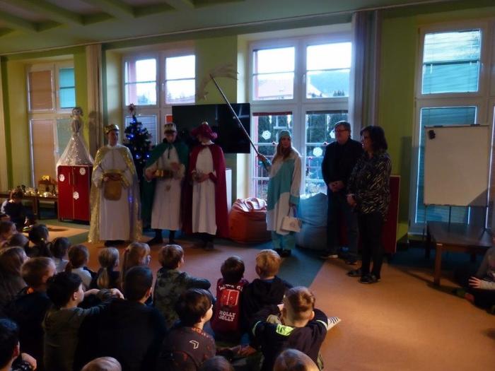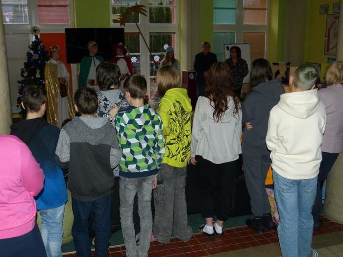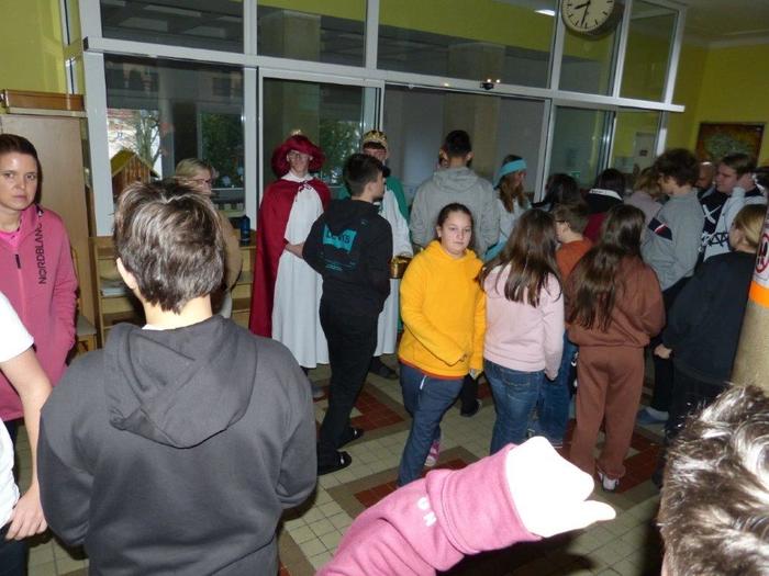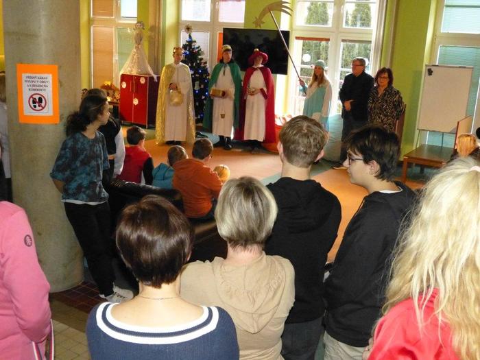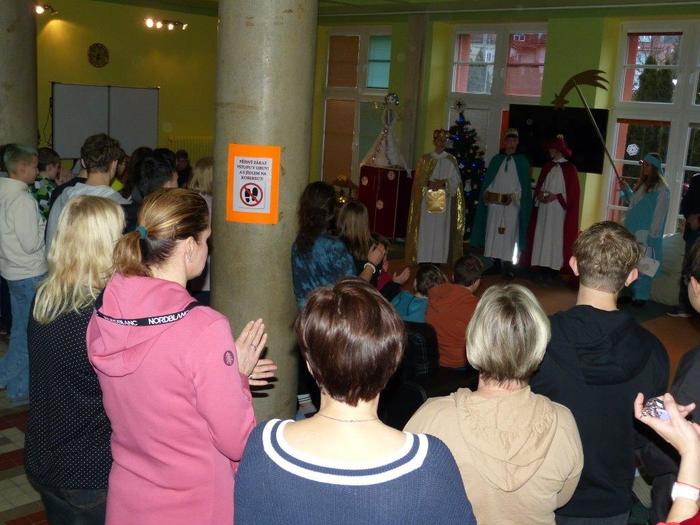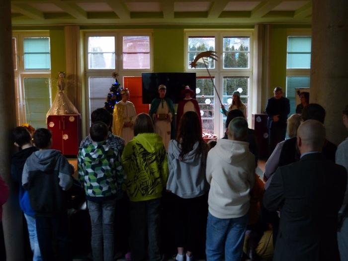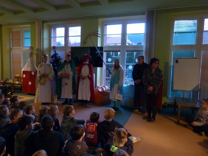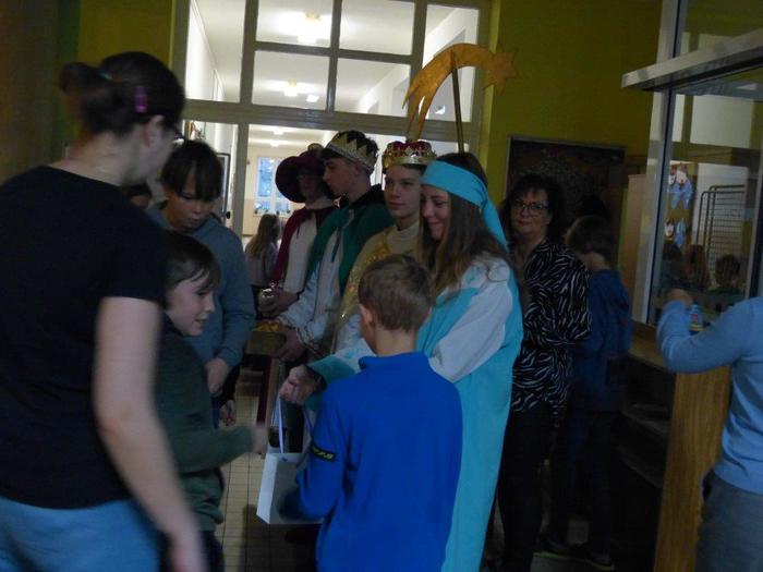 I letos se ujali těchto rolí žáci 9. ročníku - David, Béďa, David a Bára. Všichni k těmto úlohám přistupovali velmi zodpovědně, a tak byla navozena sváteční, téměř mystická atmosféra. Tři králové tradičně odpoledne doprovázejí i pana Králiče s Tříkrálovou sbírkou. Za svůj výkon si zasloužili velké uznání a mnoho chvály.