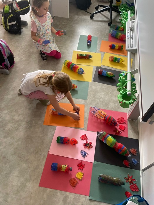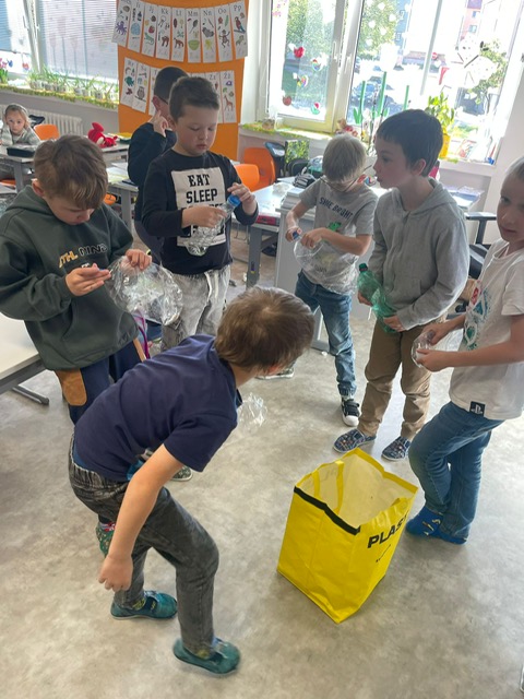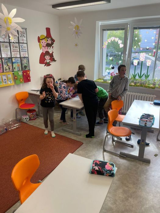 Při společných hrách a aktivitách jsme se dozvěděli spoustu zajímavých informací o plastech a o třídění odpadu vůbec. Nejdříve jsme rozdělovali obrázky (věci) podle materiálu, potom jsme se podívali na video Vzkaz v lahvi. Ukázali si, co vše patří do žlutého kontejneru, a nakonec při výtvarné aktivitě vytvořili vázu s květinami z plastových lahví.