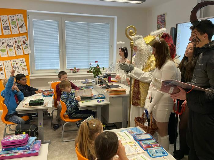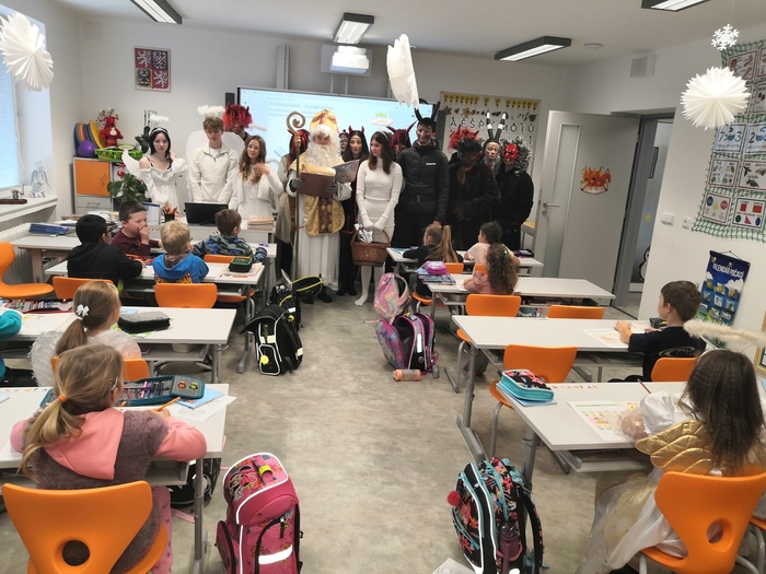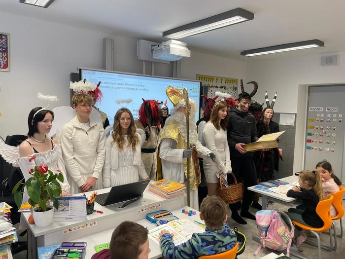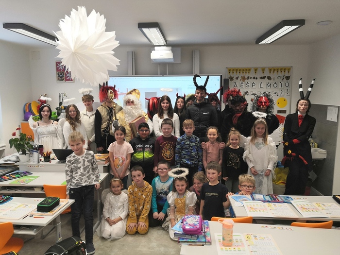 V úterý 5. 12. 2023 den před svátkem sv. Mikuláše jsme si raději všichni přeříkali básničku nebo zazpívali písničku, kdo ví, lepší je být připraven. A opravdu, i my jsme měli v naší třídě krásnou návštěvu! Mikuláši, andělům i čertům moc děkujeme :-).