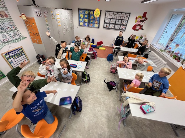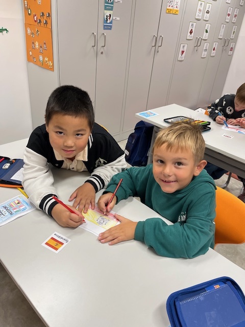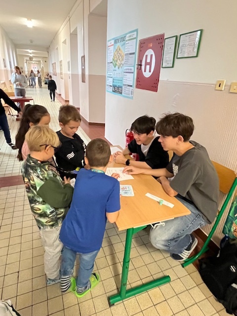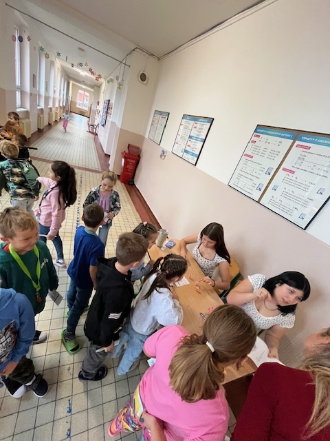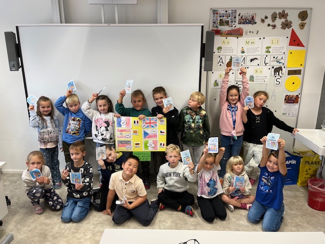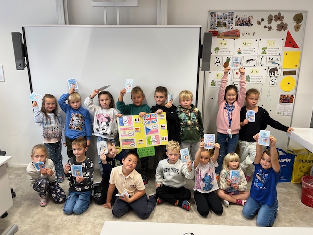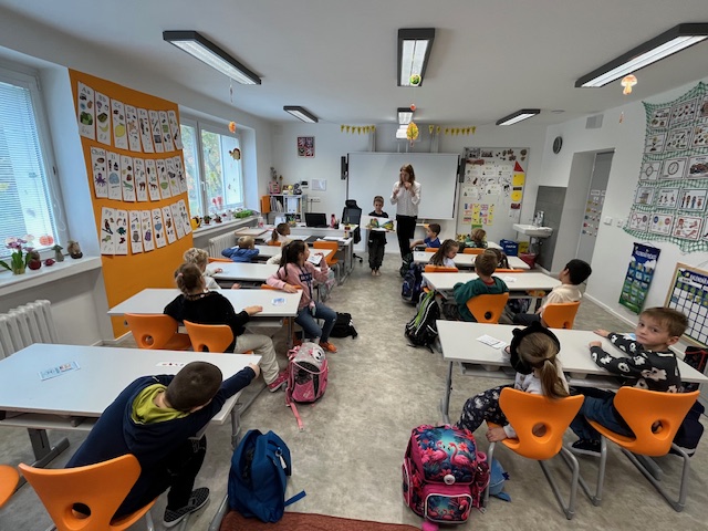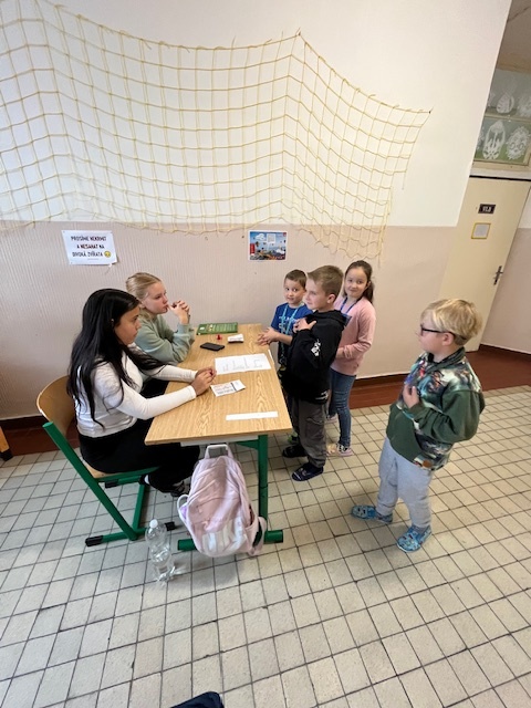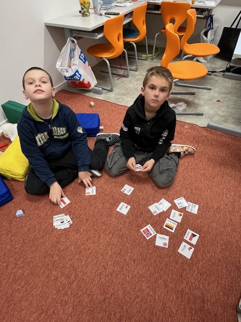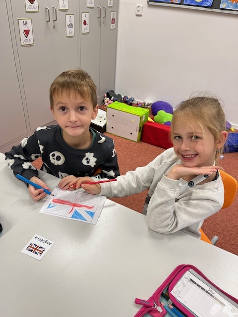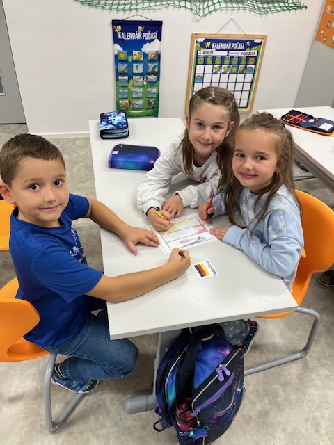 S dětmi jsme oslavili 7. 10. 2025 Evropský den jazyků. Žáci si nejdříve vybarvili svůj pas a pak už se vydali plnit zajímavé úkoly, které si pro ně připravili deváťáci. Rozeznávali cizí řeči, přemýšleli, jaká jídla se vaří v různých zemích, počítali a zdravili se v jiných jazycích. Dozvěděli se příběh The very hungry caterpillar od Erica Carla a společnými silami vytvořili plakát s vlajkami a pozdravy v různých zemích. Zahráli si také pexeso s vlajkami, dokonce už několik vlajek poznají i bez nápovědy.