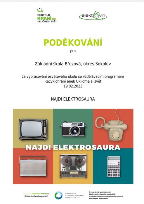 V dalších aktivitách se děti zamýšlely nad vlastním chováním a nad tím, jak k vysloužilým elektrospotřebičům přistupují doma v jejich rodinách, dozvěděli se informace o pravidlu 6R vedoucímu ke snížení spotřeby a množství odpadu, o významu zpětného odběru elektra a o recyklačním koloběhu vysloužilého elektra. Z programu Recyklohraní nám přišlo poděkování za splnění tohoto osvětového úkolu. Vážíme si toho.
