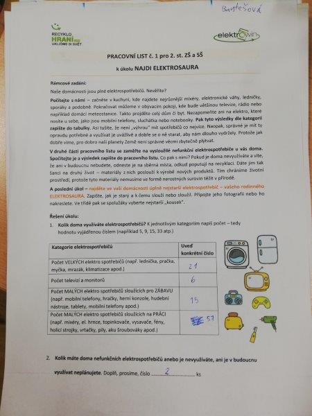 Plněním osvětového úkolu se žáci pustili do pátrání po starých, nepoužívaných nebo nefunkčních elektrospotřebičích ve svých domácnostech. Měli za úkol doma vyhledat a vyfotit nejstarší elektrospotřebič – tzv. Elektrosaura.