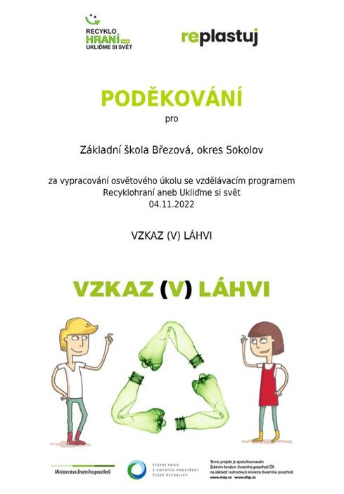 Zapojili jsme se s našimi žáky do plnění osvětového úkolu programu Recyklohraní aneb Ukliďme si svět.