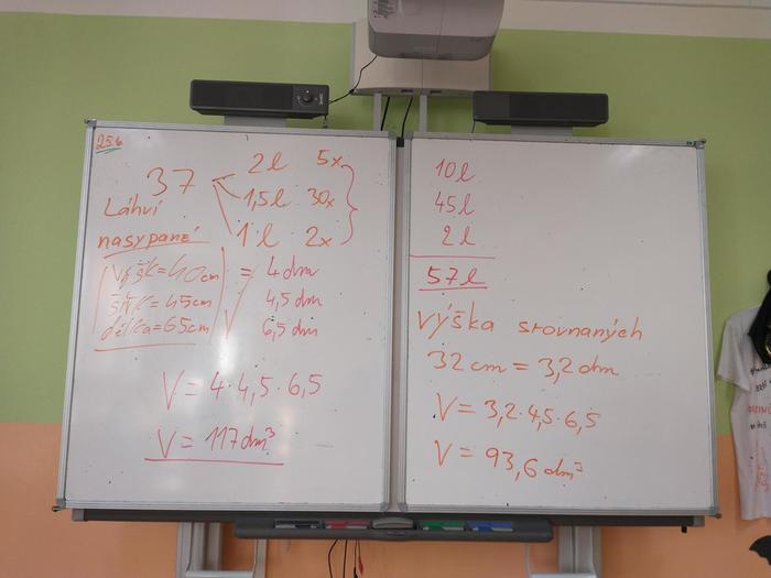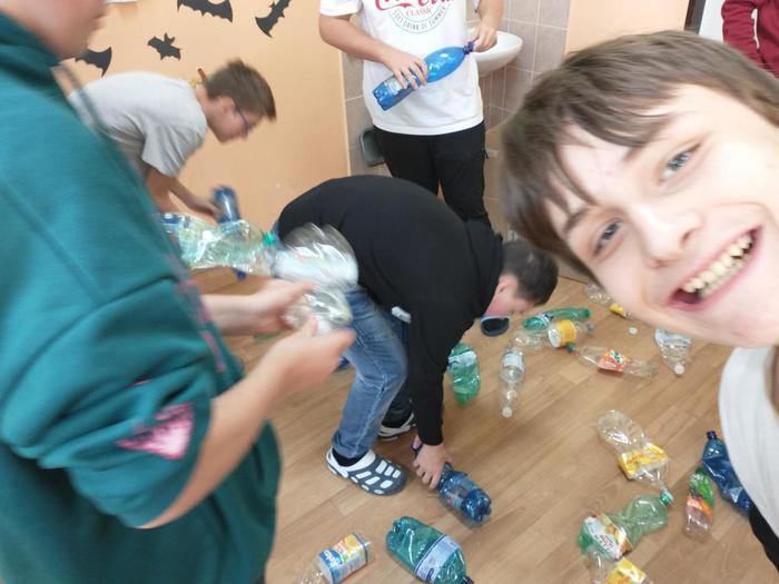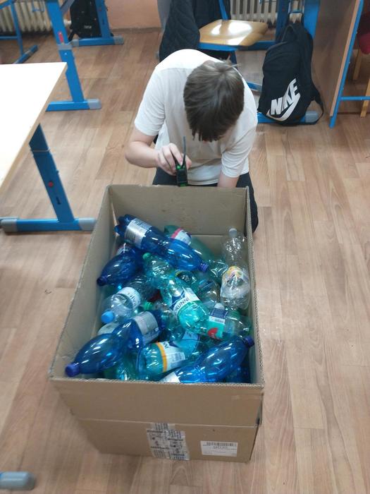 Doprovodný pokus se sešlapáváním lahví v rámci hodiny fyziky si zase vyzkoušeli osmáci s p. učitelem Očkayem. Zjistili, i díky výpočtům, že když nebudeme láhve sešlapávat, sběrné nádoby se musí častěji vyvážet, což přináší větší nároky na dopravu, potažmo pohonné hmoty, a to způsobuje vyšší produkci skleníkových plynů.